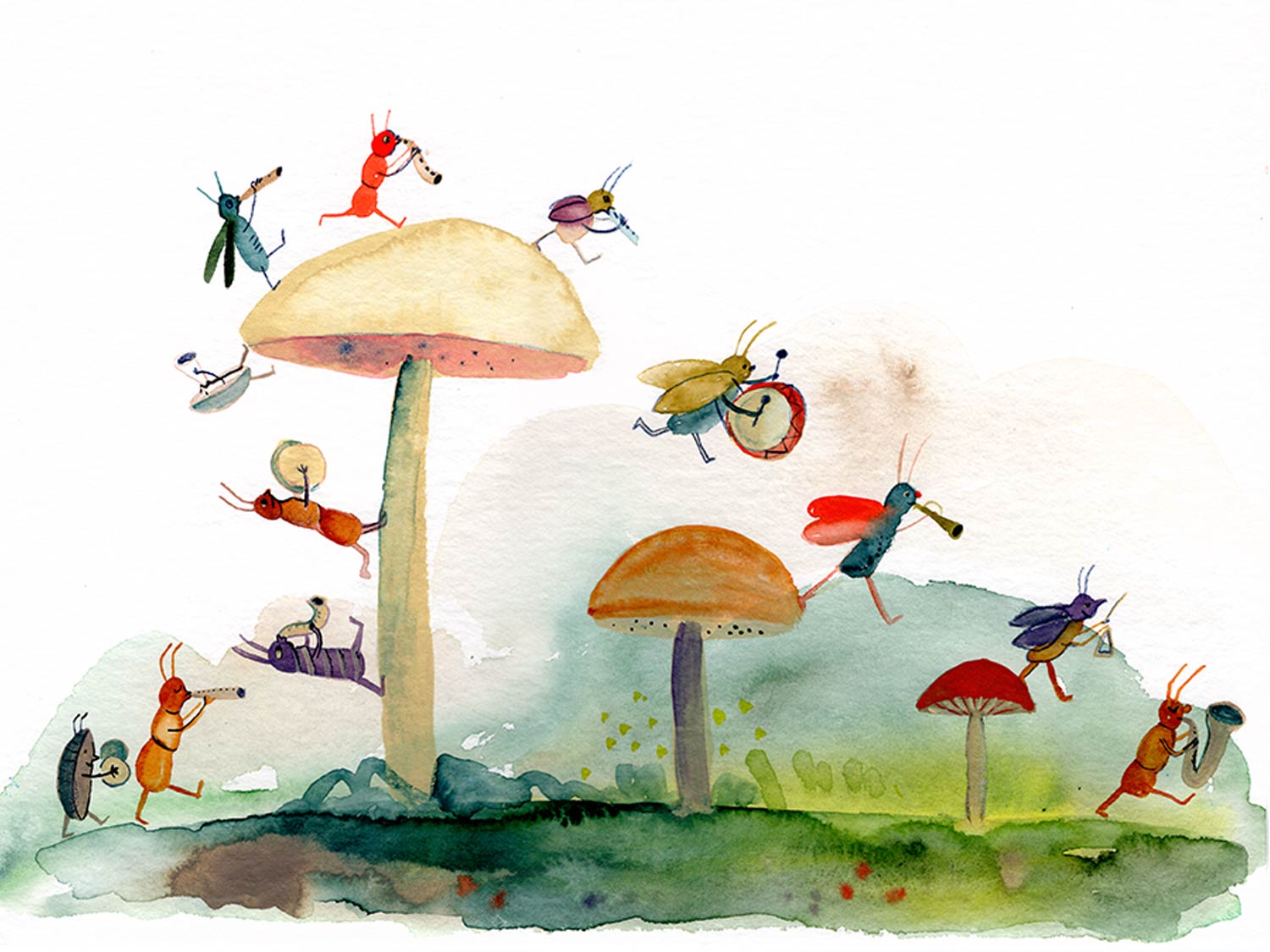 On the forest floor, tiny insects gather to play their instruments and fill the woods with music. Painted in watercolour and mixed media, this illustration captures the joyful rhythm of nature’s smallest musicians.