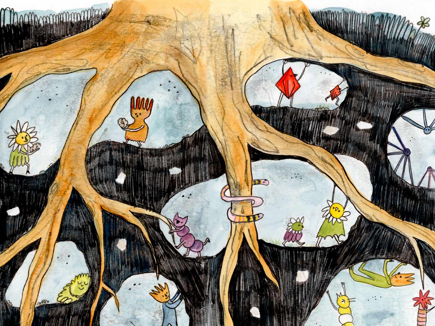 Do you ever wonder who lives in your garden? Let me tell you a secret, it's more than bugs and bees. Much more. A picturebook about little garden spirits and what they do.The artwork is created using transfer monoprint and watercolours.